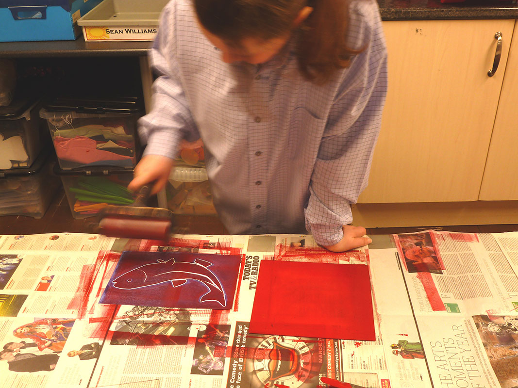 Over the years I have run many printmaking workshops, with participants from three years old to ninety (not at the same time!); in inner cities or remote rural areas; in schools, village halls, festival tents and in galleries; in primary, secondary and special education; with lower ability children or high flyers; in further and higher education; on themes as diverse as mining, landscape, bicycles, portraiture, emotions and poetry. There are many different approaches to making an original print and there is no subject that cannot be handled through the medium of printmaking.