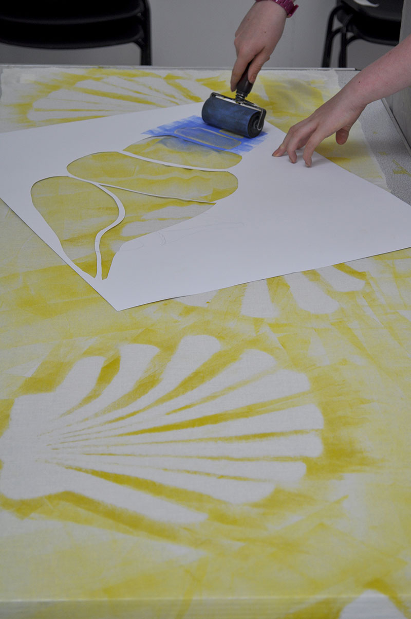 I have led a number of workshops with various adult support groups that have a focus on a particular need or circumstance. Examples of these include stencil printing with Deafblind adults; printing from natural objects with a group affected by cancer; printing from natural objects and collage printing with a group of carers, as part of the Gwanwyn Festival (celebrating creativity in older age); and printing from natural objects with adults who have suffered a stroke.